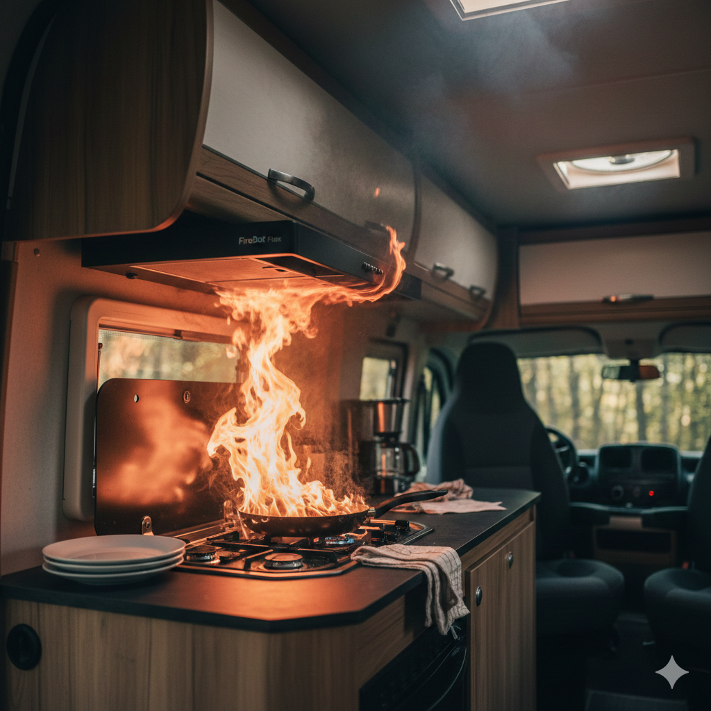 Fires don't wait for you to be present. Traditional fire extinguishers are useless if you are sleeping in the back or enjoying the outdoors. FireBot Flex monitors your cooking surface constantly, detecting and suppressing stovetop fires automatically. This ensures your rig remains protected even when you aren't standing right at the stove, providing true 24/7 peace of mind.