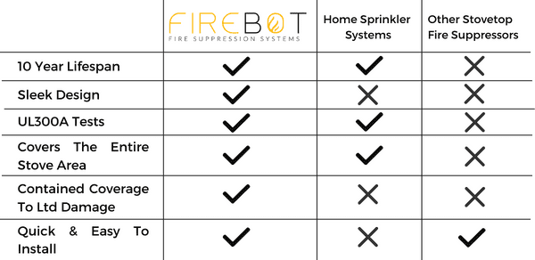FireBot is the world’s first smart cooktop fire suppression system that utilizes a proprietary fire suppression liquid to safely and quickly suppress the types of fires that account for half of all residential fires — those that originate in the kitchen. Here’s how FireBot stacks up against and solidly outperforms all of our competitors!